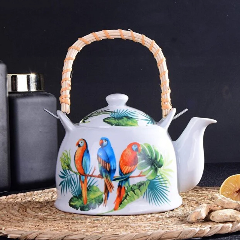 قوری دسته حصیری طرح طوطی Miss Betty مدل Parrot یکی از محصولات خاص و چشم نواز برای سرو چای و دمنوش است که طراحی متفاوت و کیفیت ساخت بالایی دارد. این قوری با بدنه لعابی و طرح زیبای طوطی، جلوه ای هنری و خاص به میز پذیرایی شما می بخشد. استفاده از دسته حصیری در طراحی، علاوه بر ایجاد ظاهری سنتی و زیبا، جابجایی قوری را راحت تر کرده و در برابر حرارت نیز عایق مناسبی محسوب می شود. لعاب به کار رفته در بدنه قوری باعث می شود سطح آن براق، مقاوم و بادوام باشد. این ویژگی مانع از تغییر رنگ، خط و خش و جذب لکه می شود و نظافت قوری را بسیار آسان می کند. همچنین لعاب کمک می کند طعم و عطر طبیعی چای یا دمنوش حفظ شده و تغییری در کیفیت نوشیدنی ایجاد نشود. ظرفیت مناسب این قوری آن را برای استفاده روزانه یا پذیرایی از مهمانان به گزینه ای ایده آل تبدیل کرده است. طراحی دسته ارگونومیک و درب استاندارد، راحتی و ایمنی بیشتری هنگام استفاده فراهم می کنند. قوری دسته حصیری طرح طوطی Miss Betty مدل Parrot علاوه بر کارایی، یک اکسسوری تزئینی زیبا نیز به شمار می رود که می تواند جلوه ای خاص به دکور آشپزخانه یا میز پذیرایی شما بدهد. ترکیب طرح منحصر به فرد، کیفیت ساخت بالا و دسته حصیری مقاوم، این محصول را به انتخابی شایسته برای دوستداران ظروف خاص و متفاوت تبدیل کرده است