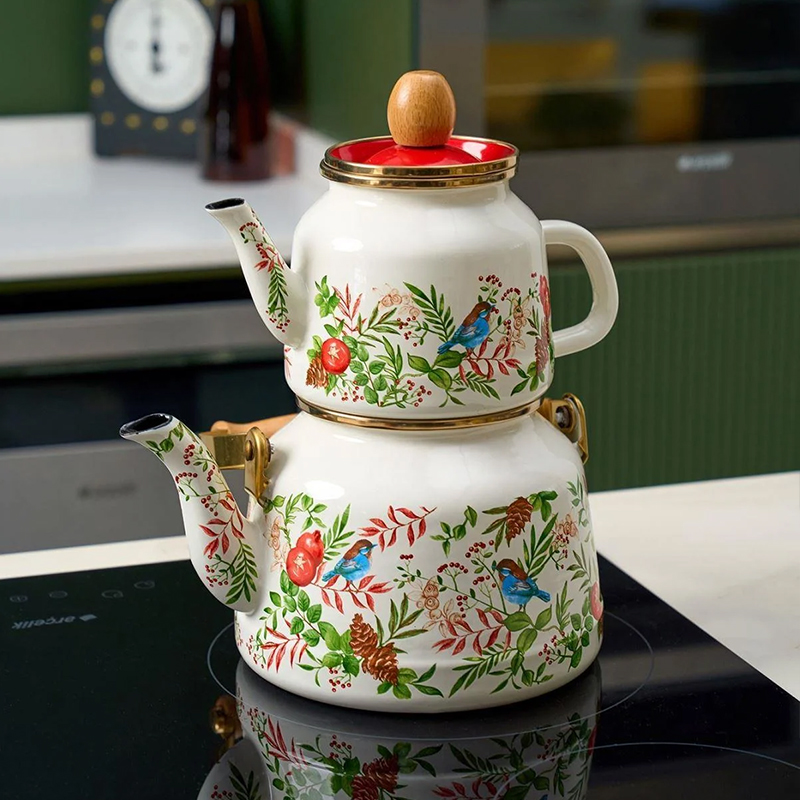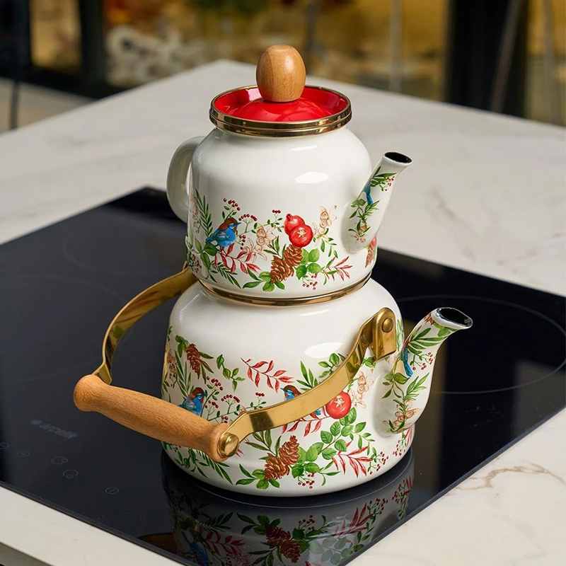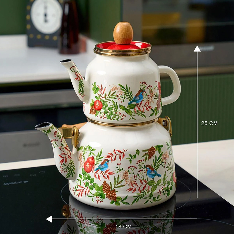 ست کتری و قوری میس بتی مدل Mira یکی از محصولات محبوب و پرطرفدار برند ترکیهای میس بتی است که با کیفیت بالا و طراحی زیبا توجه بسیاری از خانوادهها را به خود جلب کرده است. این محصول از جنس لعابی مرغوب ساخته شده و دارای طراحیهای متنوع و رنگارنگ با الهام از طبیعت و گلهای شیک میباشد. تقریبا حجم کتری این ست 2 لیتر و حجم قوری 1 لیتر است که برای خانوادههای 4 تا 6 نفره مناسب بوده و نیاز روزانه آنها را به خوبی پوشش میدهد. جنس لعابی محصول باعث حفظ طعم و عطر چای و دمنوشها شده و همچنین نگهداری و تمیز کردن آن را آسانتر میکند. دستههای این ست از جنس استیل ضدزنگ ساخته شده که علاوه بر زیبایی ظاهری، مقاومت بالایی در برابر حرارت دارد و امکان جابجایی آسان را فراهم میکند. طراحی ارگونومیک دستهها باعث راحتی بیشتر کاربر هنگام استفاده میشود. این محصول با گارانتی کیفیت و ضمانت اصالت کالا عرضه میشود. ست کتری و قوری میس بتی مدل Mira نه تنها ابزاری کاربردی برای تهیه چای است، بلکه به عنوان یک عنصر تزئینی زیبا نیز میتواند فضای آشپزخانه را جذابتر کند. این محصول مناسب استفاده روزانه بوده و دوام بالایی در برابر استفادههای متعدد دارد